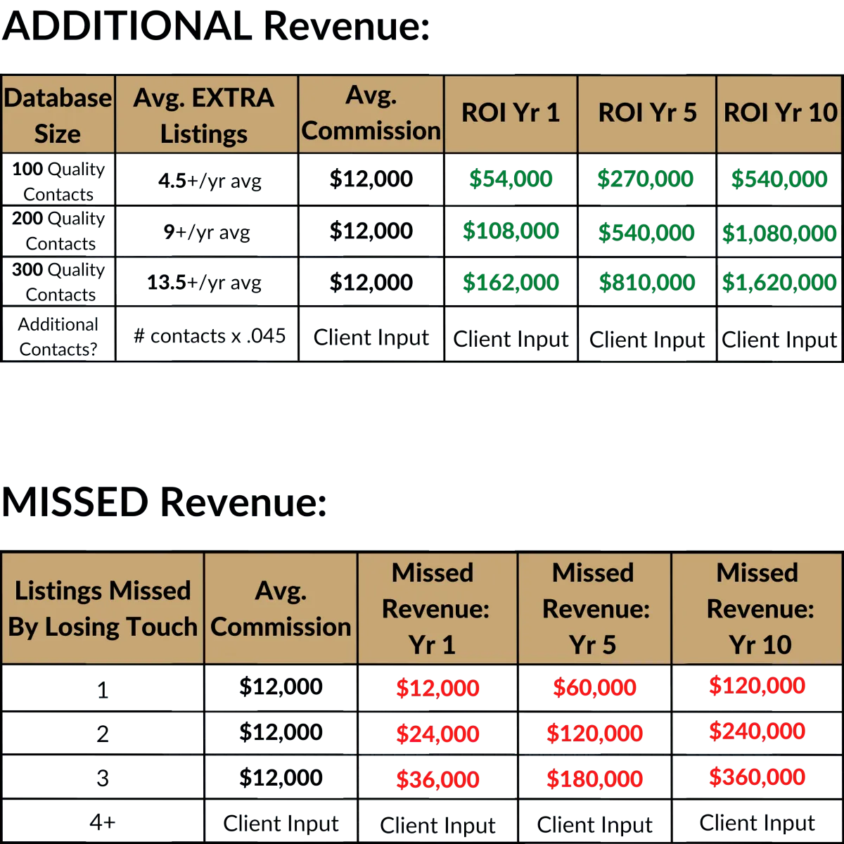 Based on our clients' results, we know if you have 200 past clients you are missing 7.5 listings & referrals per year on avg.
